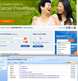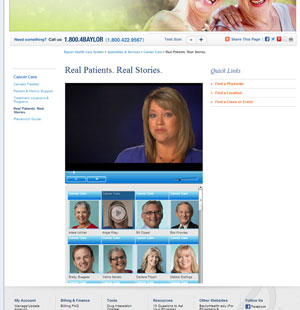 Baylor has over 300 videos to showcase on the website. They wanted to categorize them by specialty, hospital affiliation, and year of production. I created one flash file that could be used in multiple places around the site. Based upon parameters set on the page, the flash will display videos by specialty, hospital affiliation, or year of production.